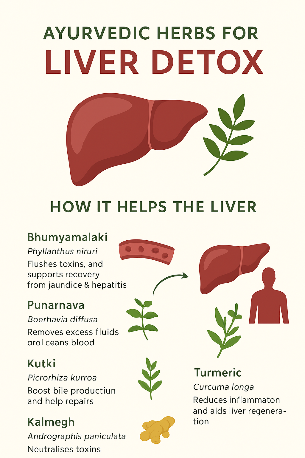 Detoxification Phase: Herbs like Bhumyamalaki, Kalmegh, and Triphala help flush out metabolic waste, alcohol residues, and chemical toxins from liver cells.